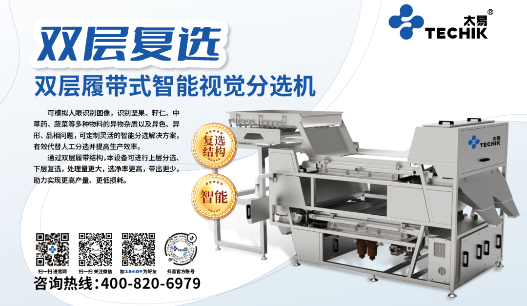 -雙層履帶機(jī)可代替多名人工,智能識(shí)別果殼、金屬玻璃等異物雜質(zhì),以及霉變粒、雙仁粒、缺損粒、機(jī)械損傷粒、壓痕粒等不合格品。